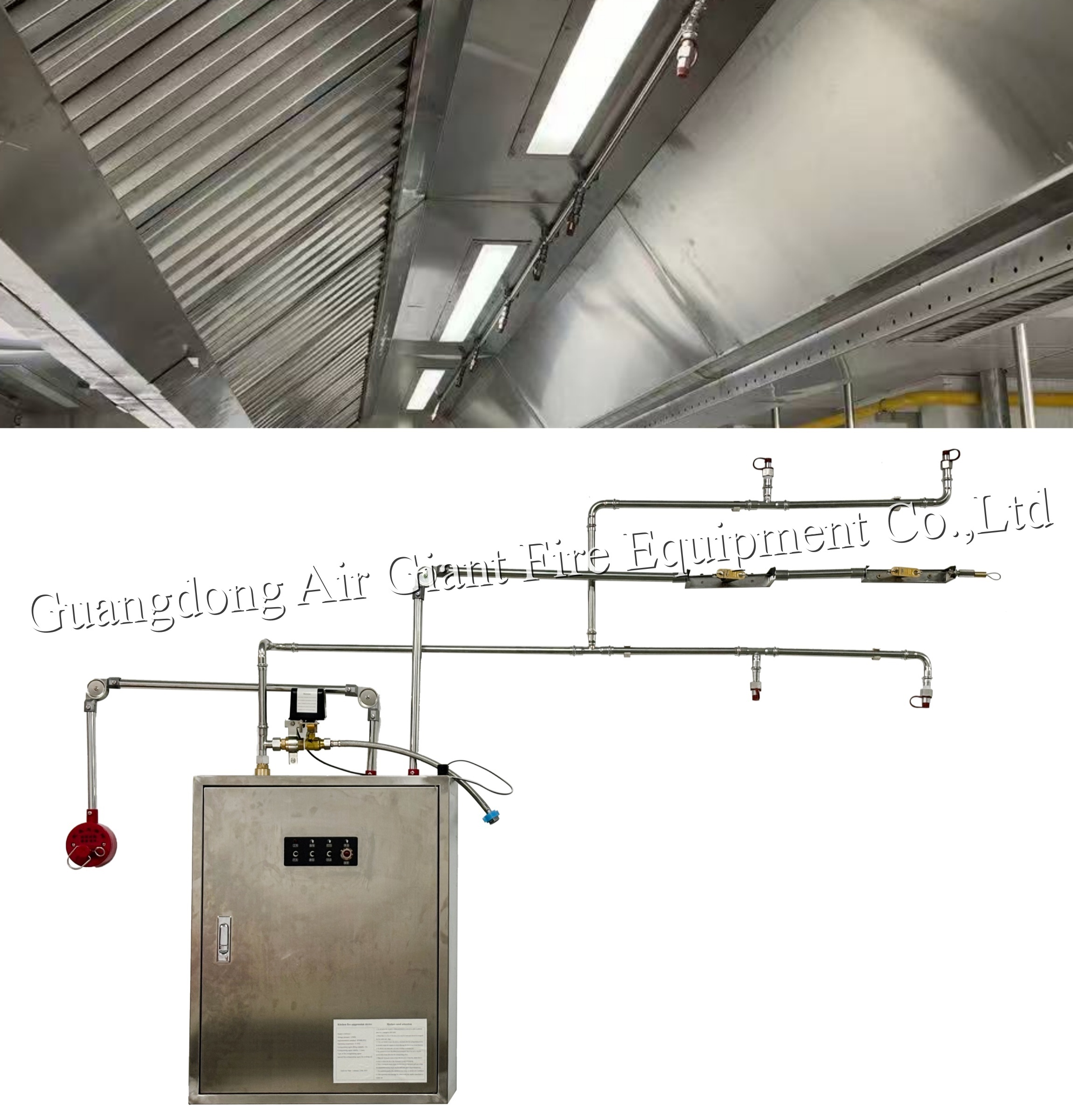 1.放出メカニズムが活性化されると,液体の消火剤 (泡,乾燥粉末,(または他の特殊剤) は,キッチンストーブ機器の表面にノズルを通って噴霧されます.排気孔,油脂フィルター,排気管の内側もこの 特殊 な 剤 は,油 鍋 の 火 を 素早く 消し,油蒸気 の 燃焼 を 抑制 する 覆い 層 を 形成 し ます再び点火を防ぐため